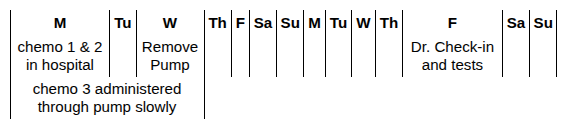 Rebecca will be doing chemo in 3 month stints, every other Monday for 4-5 hours she’ll get 2 types of chemo, and then will wear a pump for 48 hours that slowly administers a 3rd chemo, then into the the doctor that Wednesday to have it removed, then meet with doctor the following Friday for blood and urine tests and then another round of chemo the following Monday. If this is confusing this may help to visualize:
